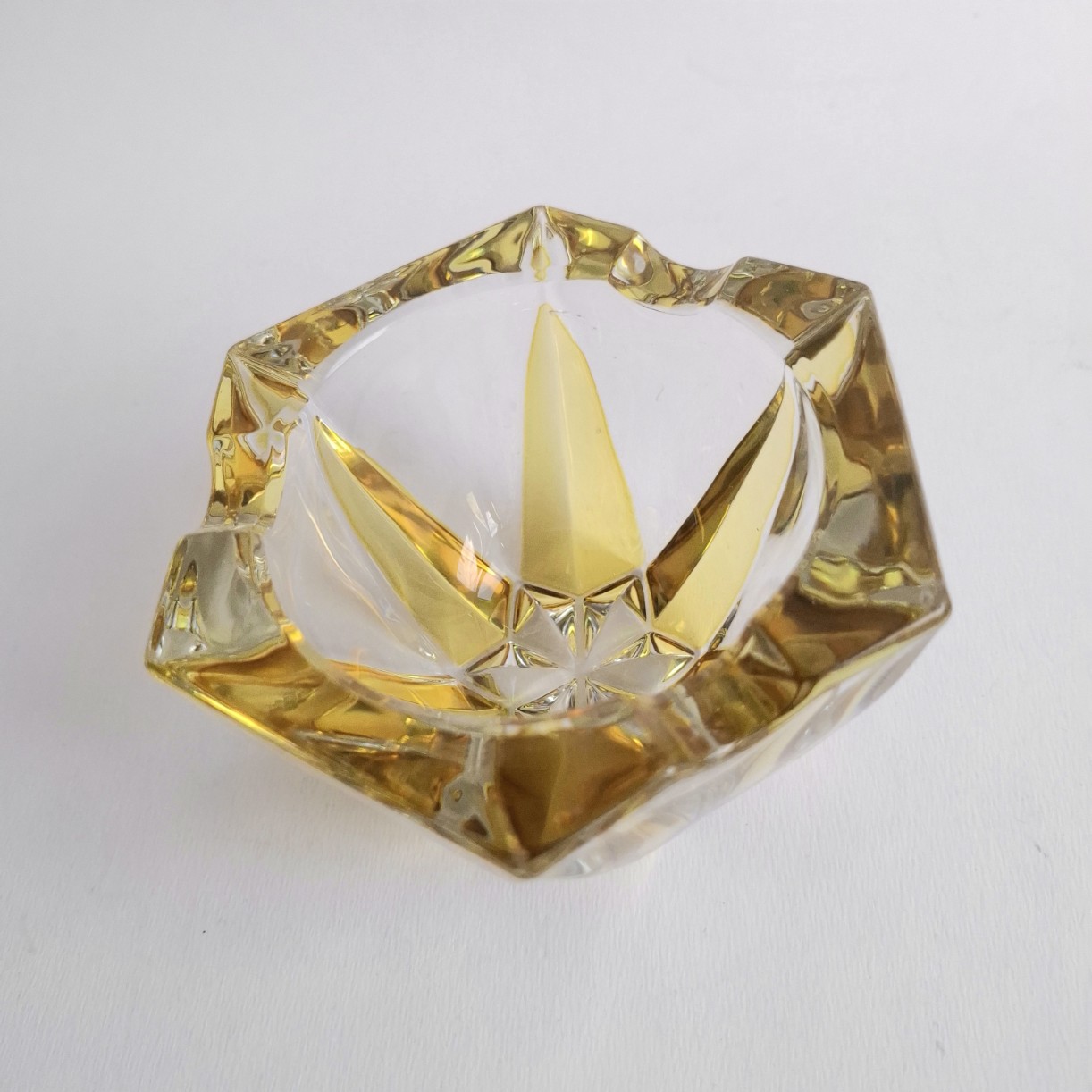 Deze asbak in geel glas is zeer mooi zeskantig vormgegeven en in nette vintage staat.