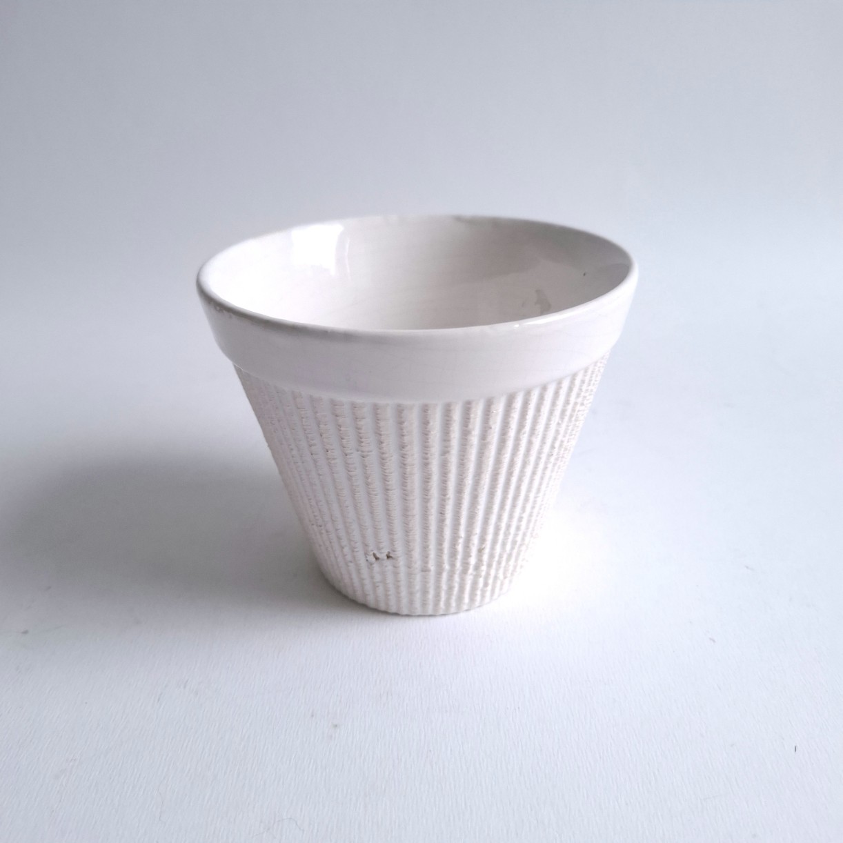 Dit crème kleurige bloempotje met verticaal motief is in goede vintage staat met wat craquelé.