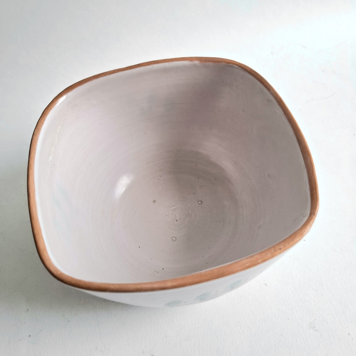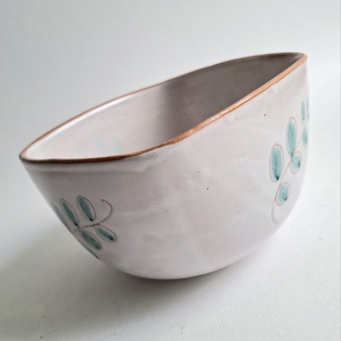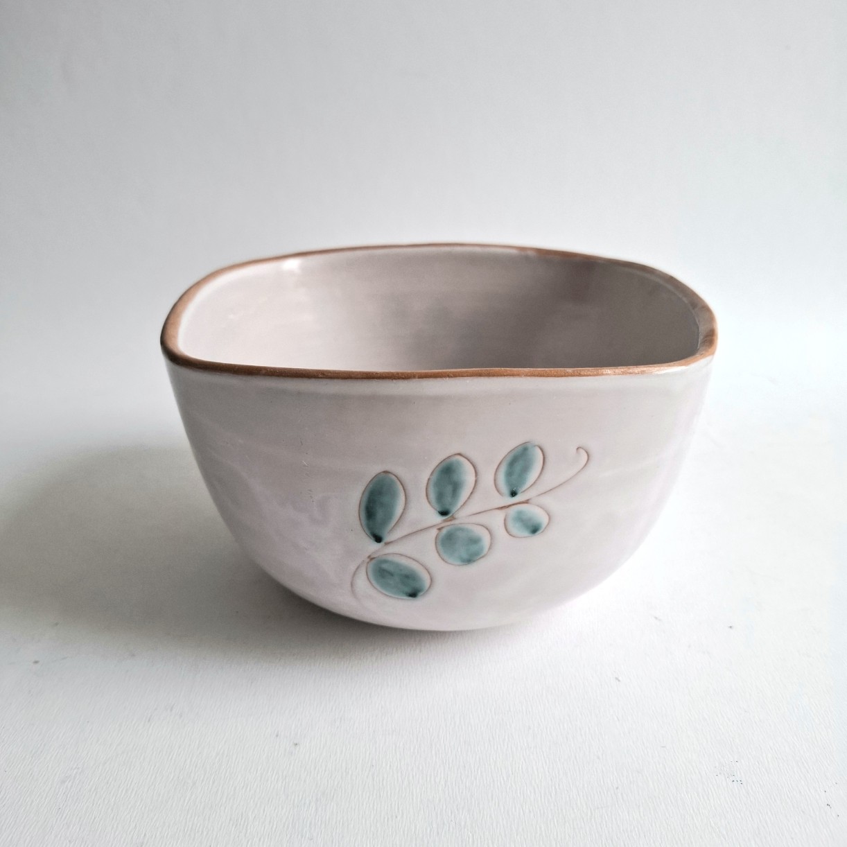 Dit aardewerk schaaltje heeft aan vier zijden een afbeelding van een tak met blaadjes.