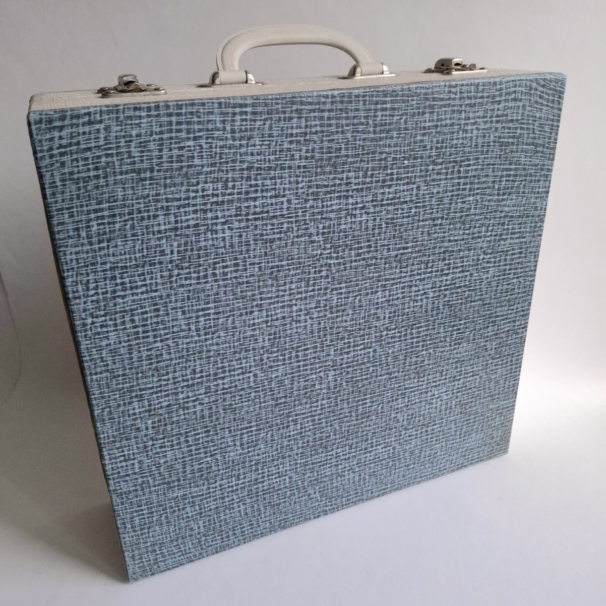 Deze LP koffer in grijsblauw en lichtgrijs/wit is nog in vrij goede vintage staat, met wat minimale beschadigingsplekjes aan de buitenkant.