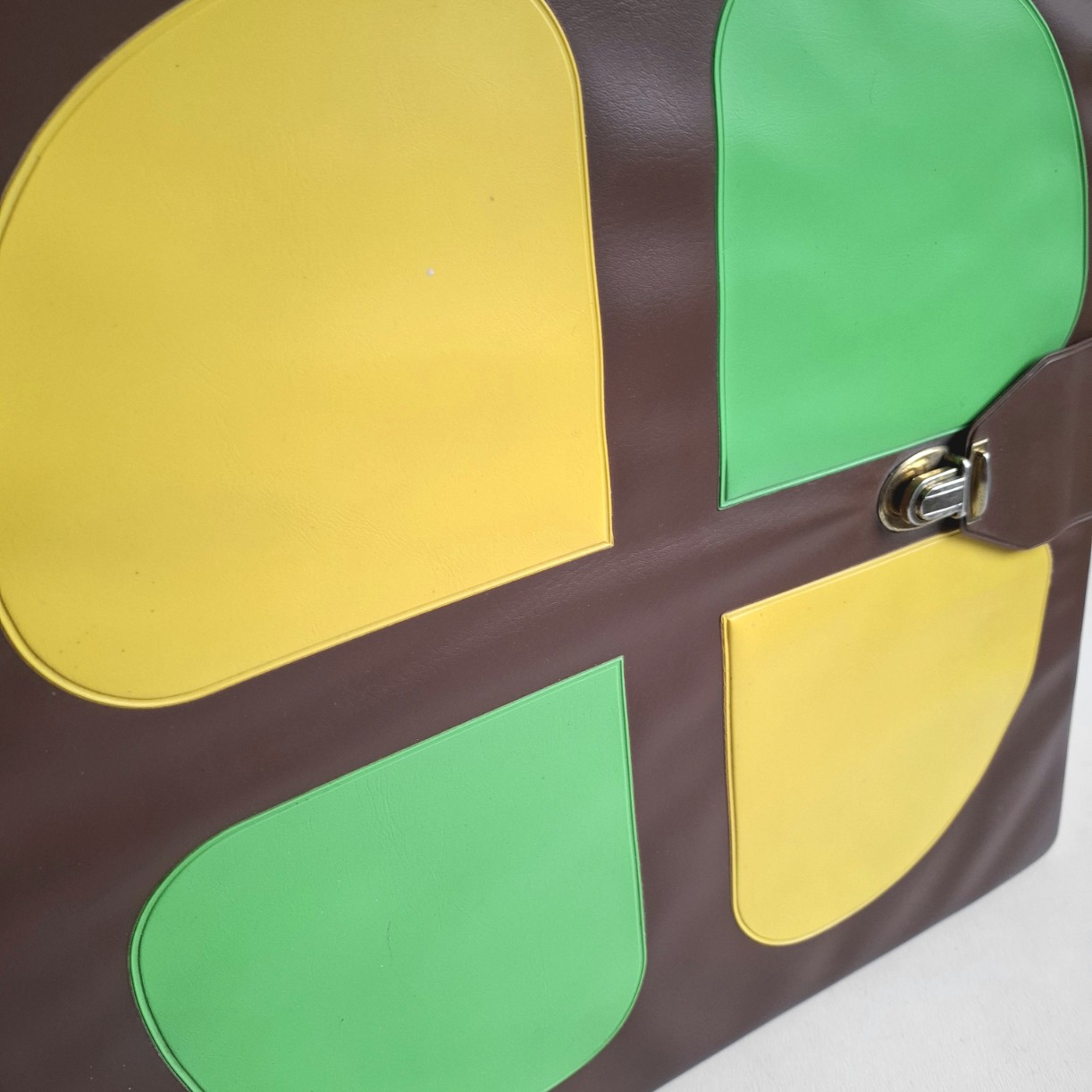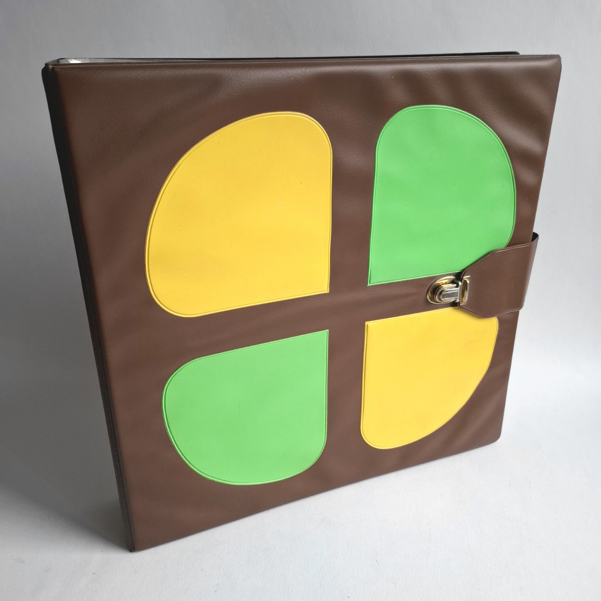 Leuke jaren 70 bruine skai map voor LP's met geel/groen kleurenmotief uit de jaren 70..