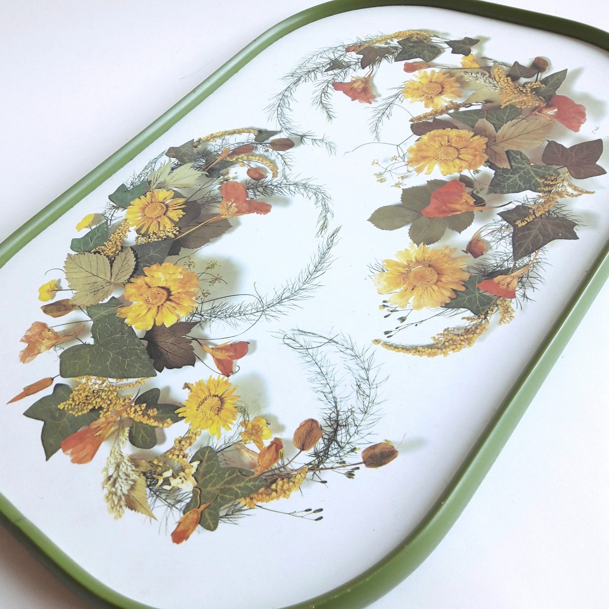 Dit dienblad met groene rand en formica blad met bloemenafbeelding is in vrij goede vintage staat.