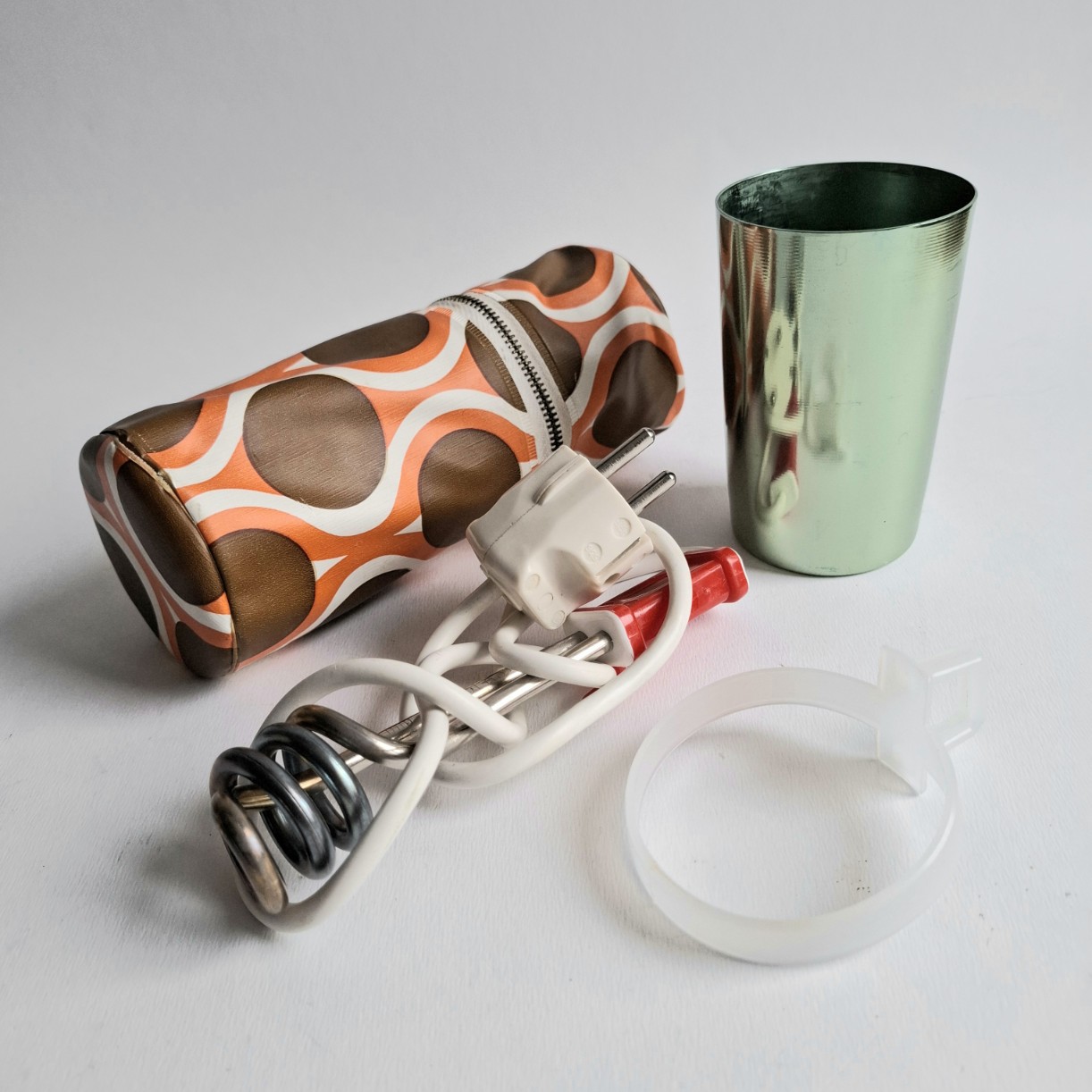 Mooie jaren 60/70 dompelaar set bestaande uit een aluminium beker, dompelaar en etui met print.