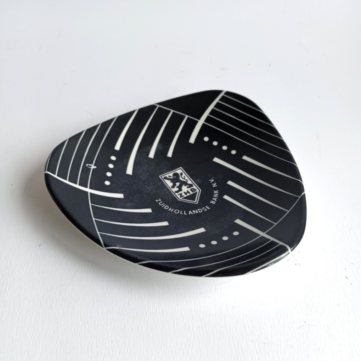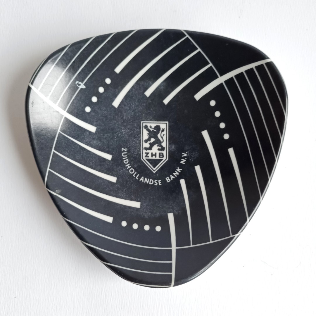 Dit schaaltje met afbeelding en tekst van de Zuidhollandse Bank N.V. is vervaardigd van het materiaal Melamine (Ornamin) door het bedrijf Cogebi.