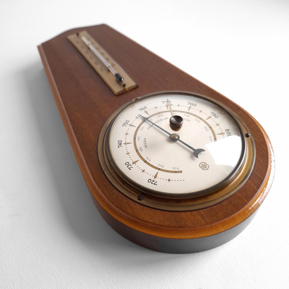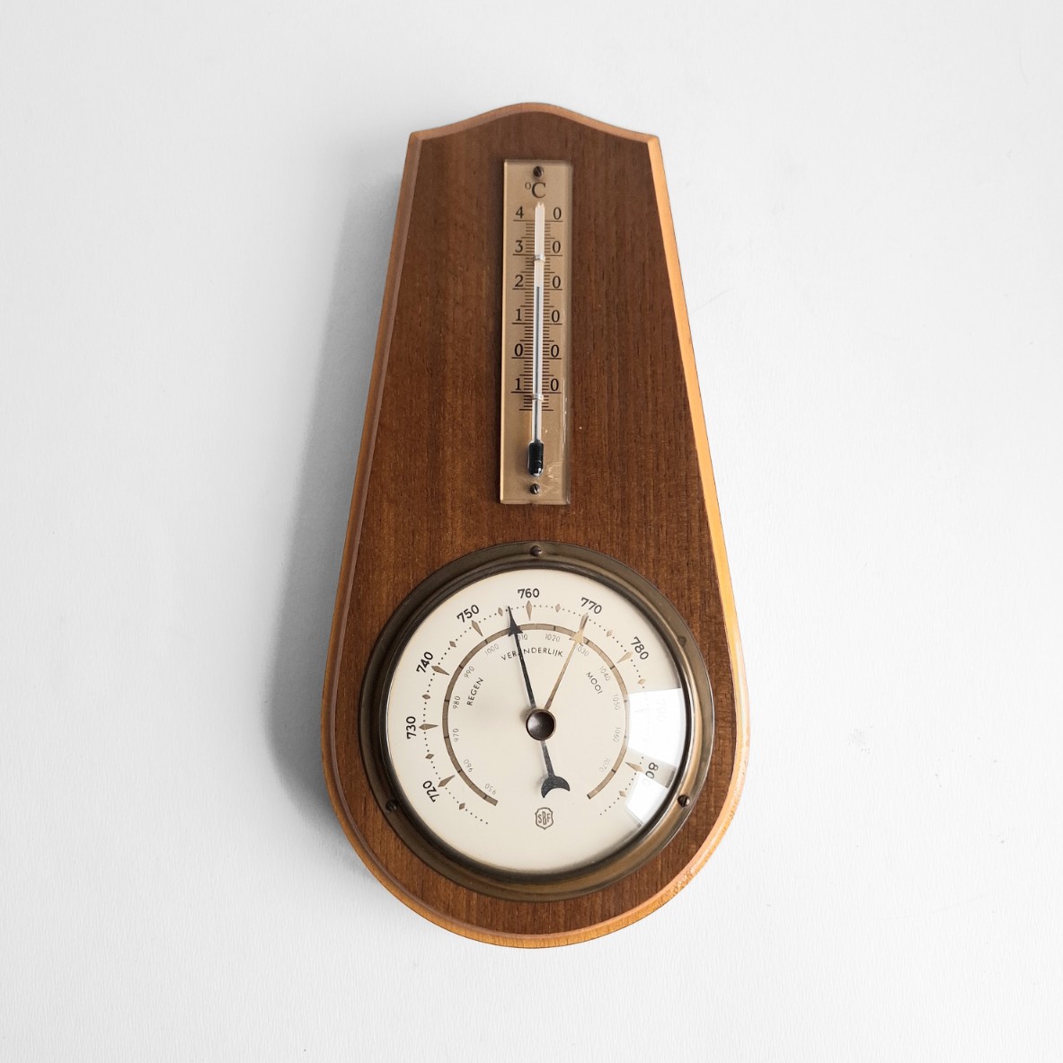 Deze mooi vormgegeven houten wand barometer met thermometer is goed werkend en in goede vintage staat.