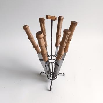 Dit metalen rekje met greep heeft een zestal mesjes met bamboe handvat en is in vrij goede vintage staat.