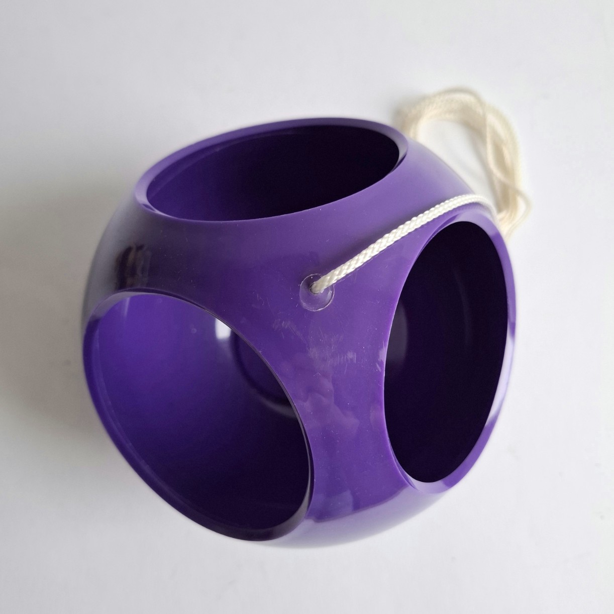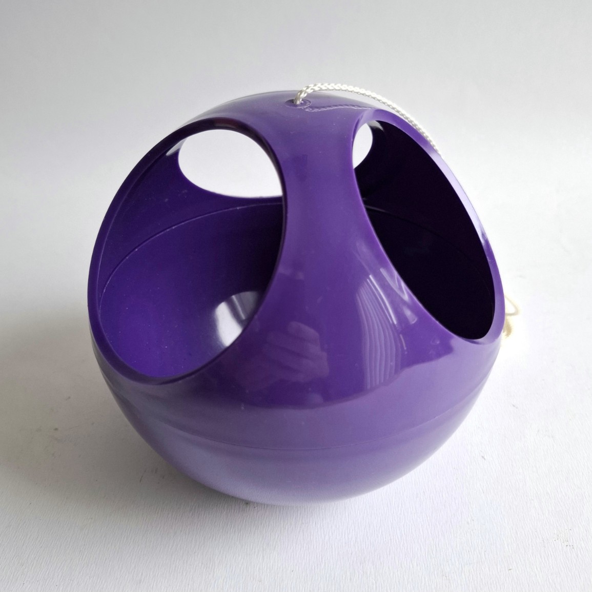 Deze leuke kunststof ronde plantenhanger in de typisch jaren 70 kleur, paars, heeft een drietal openingen voor plantjes en ophangtouwtje.