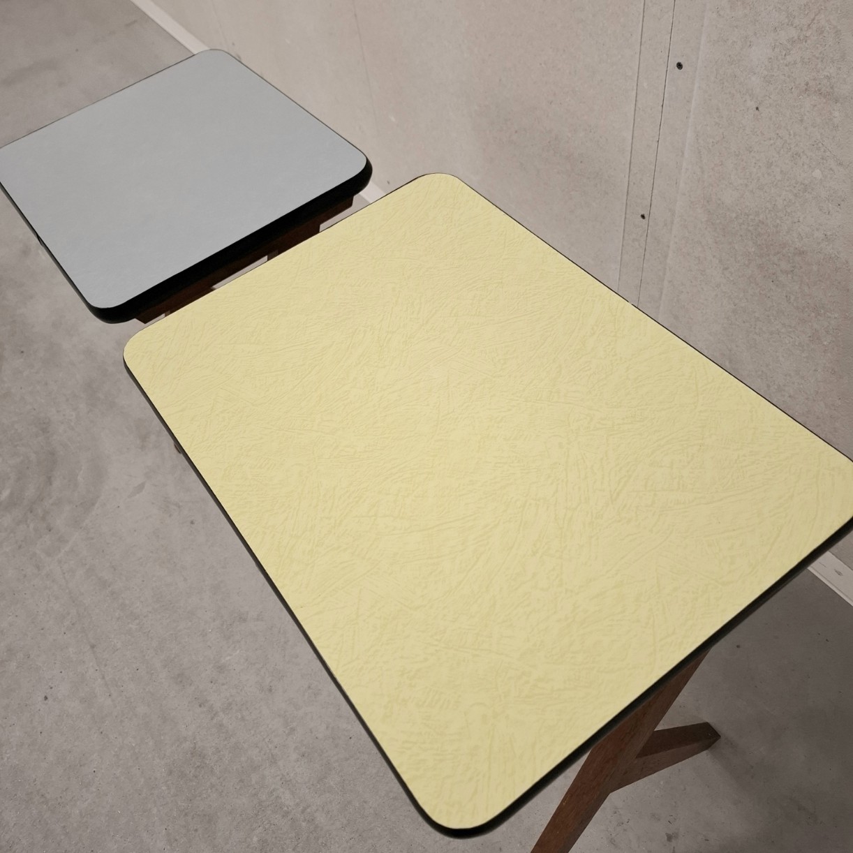 Deze twee tafeltjes hebben een mooi vormgegeven houten onderstel en beide een formica blad in de kleuren geel en grijs (lichtblauw?) met zwarte kunststof sierrand.
