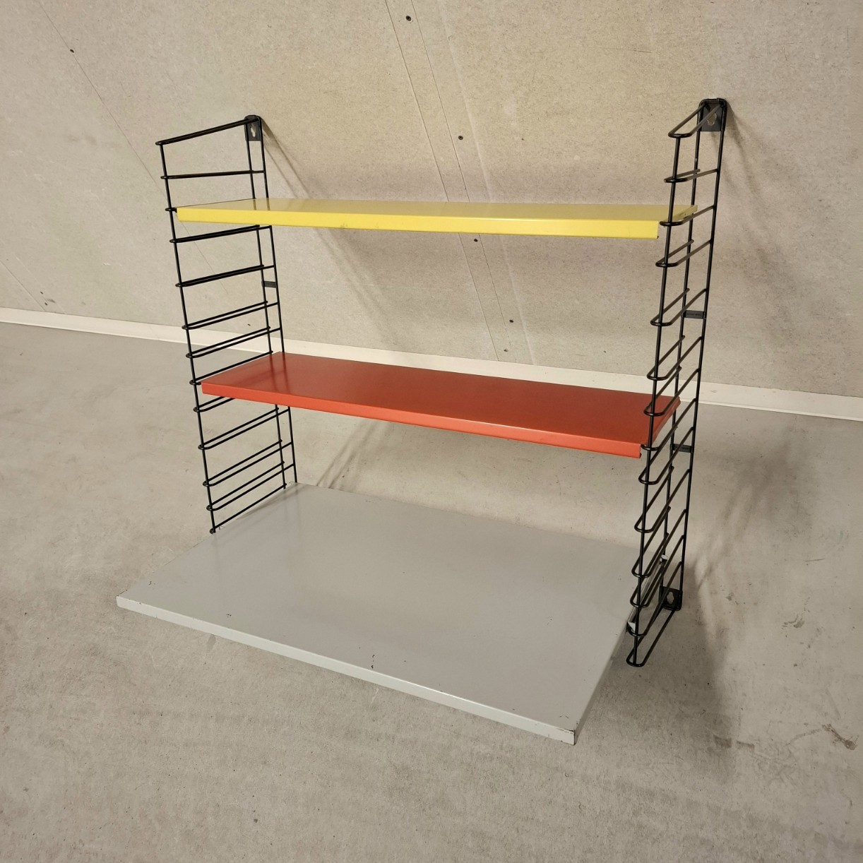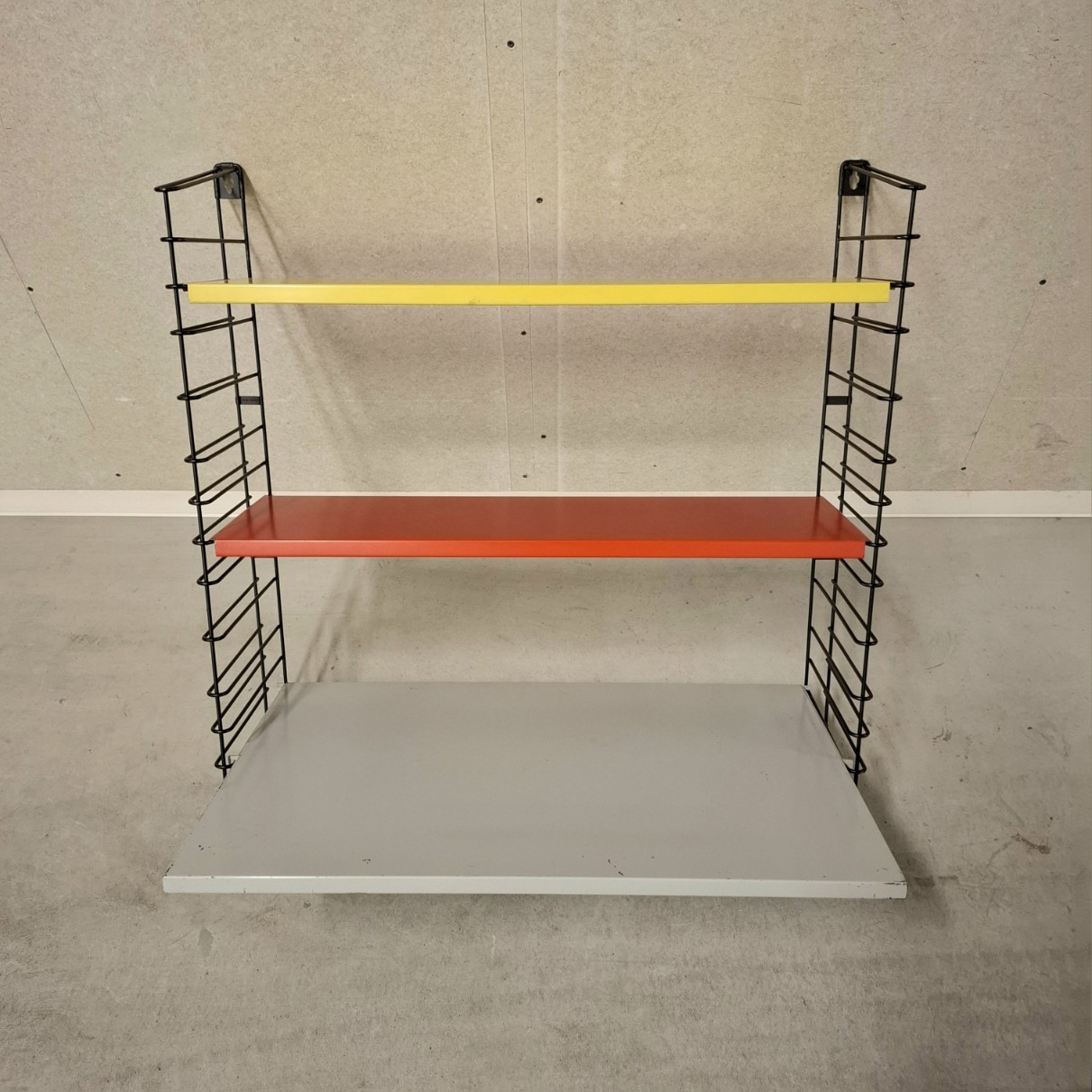 Het geheel is origineel maar in matige vintage staat met duidelijke gebruikssporen en plekjes op o.a. de gele en grijze planken (zie foto's).