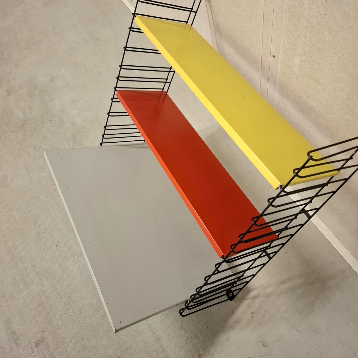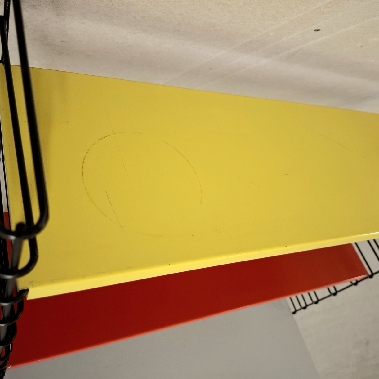 Dit “buroblad wandrek” van Tomado bestaat uit een drietal metalen planken in de kleuren rood, geel en grijs buroblad en twee zijdelen.