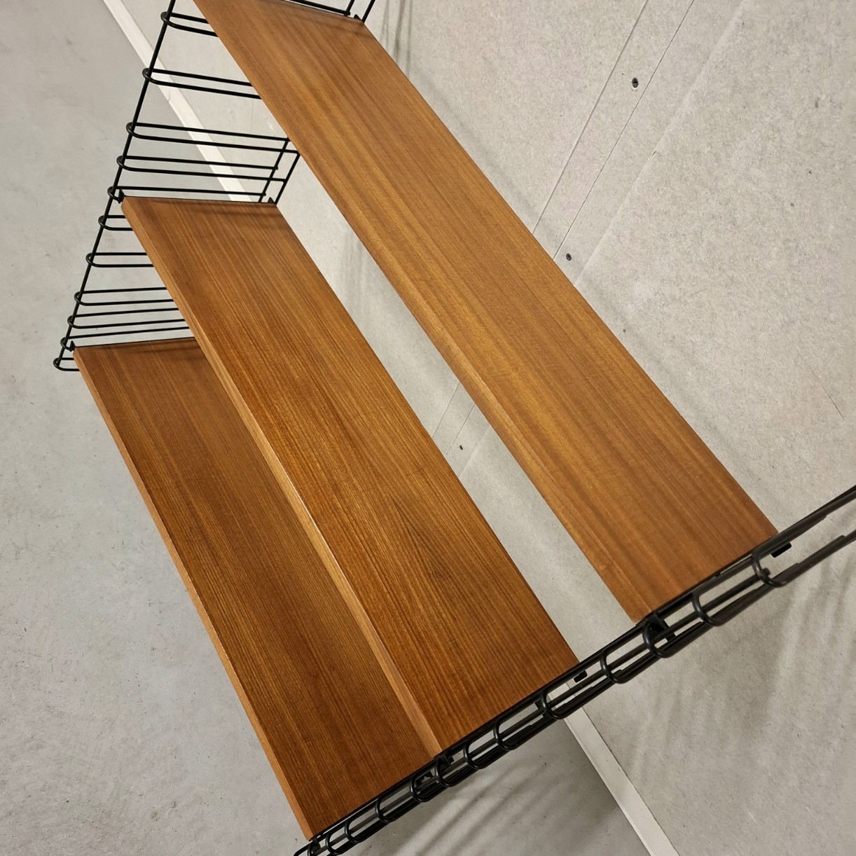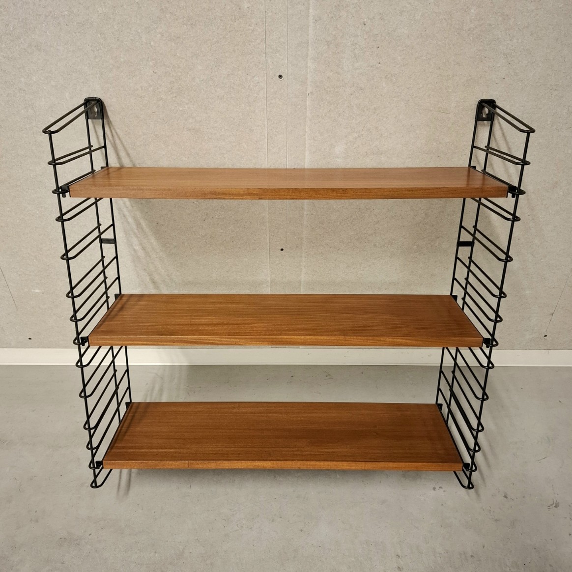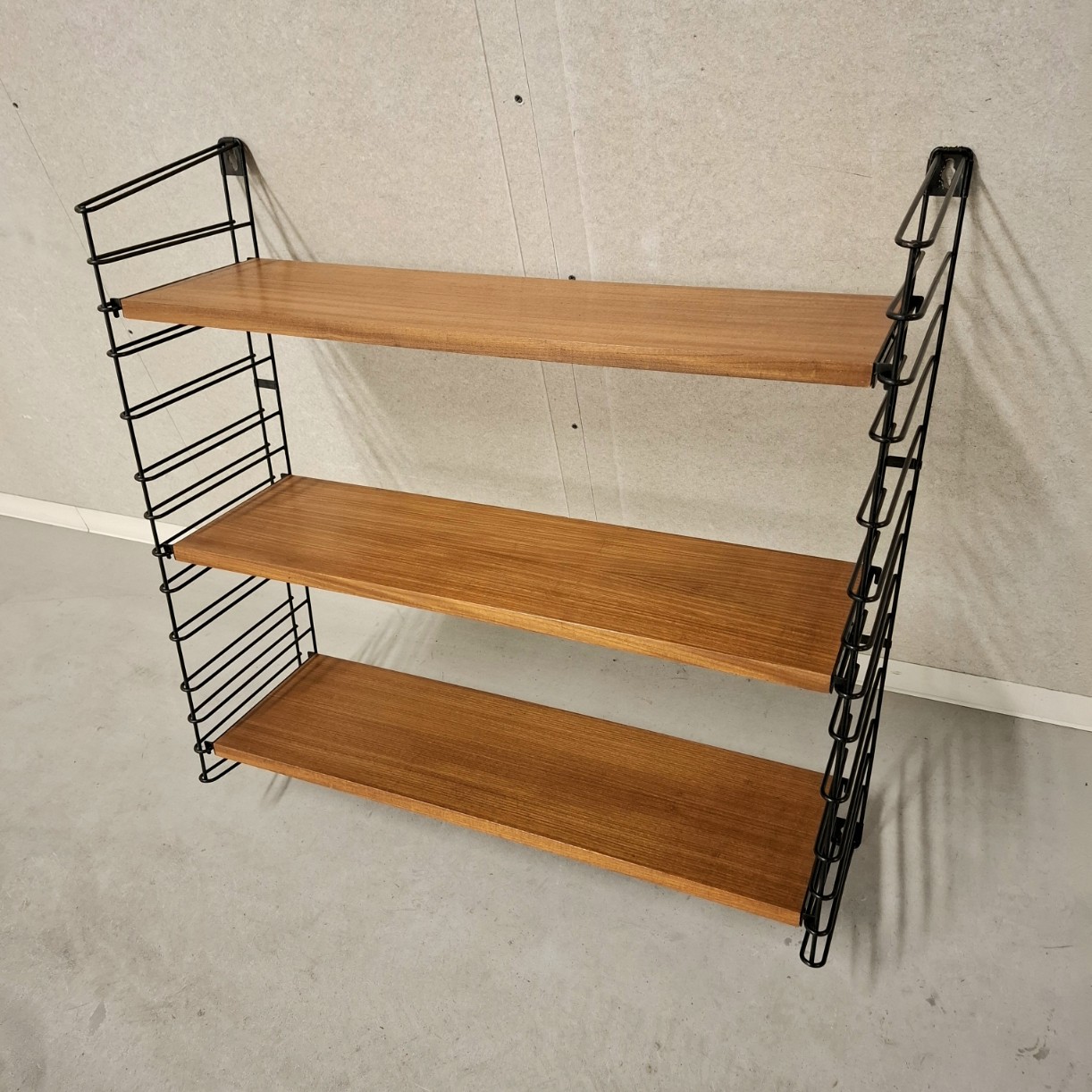 Dit wandmeubel van Tomado bestaat uit een drietal afro teak planken en twee metalen zijdelen.