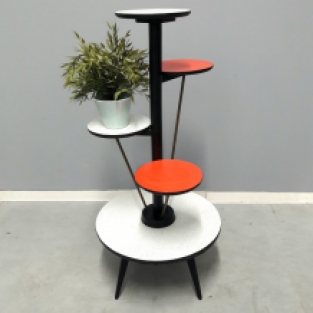 Mooie vormgegeven plantentafel uit de jaren 50/60 met vijf plateaus in wit en oranje formica. Deze plantentafel is in redelijke staat. onderste blad heeft wat ouderdomsverschijnselen en het formica heeft tevens wat gebruiksporen.