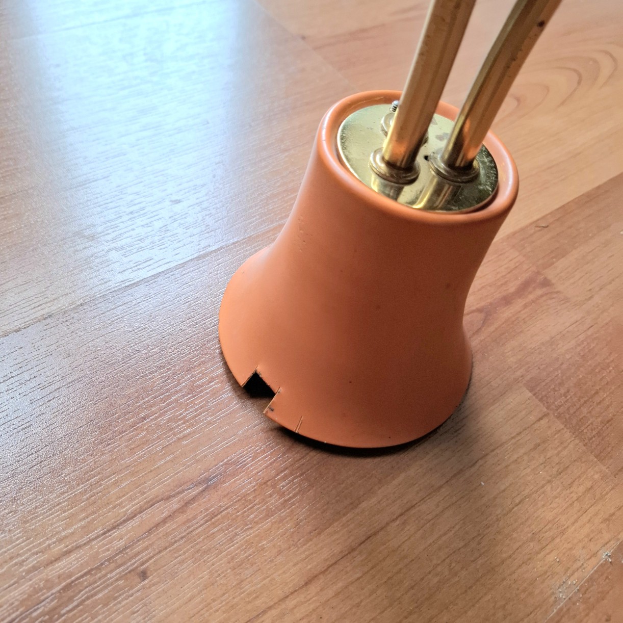 Deze (rockabilly) lamp, met productie datum Mei 1960, heeft naast deze nog zeer nette kapjes, messing details en een oranje plafondbevestiging.