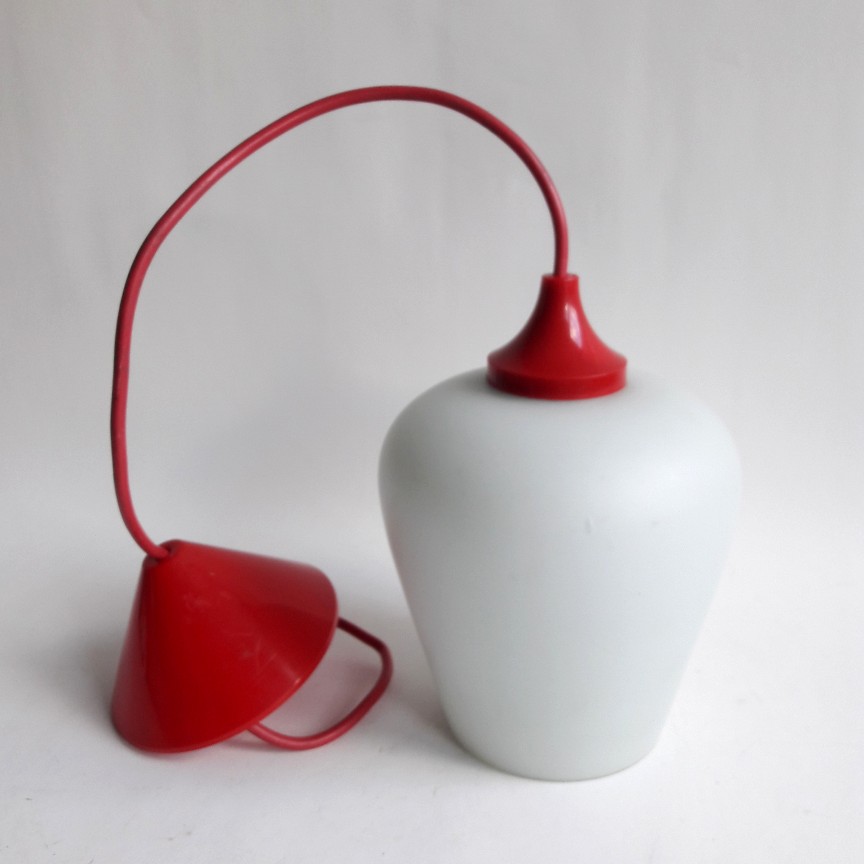 Deze plafondlamp met bijzonder gevormd glas en rode ophangdelen en snoer is in goede vintage staat.