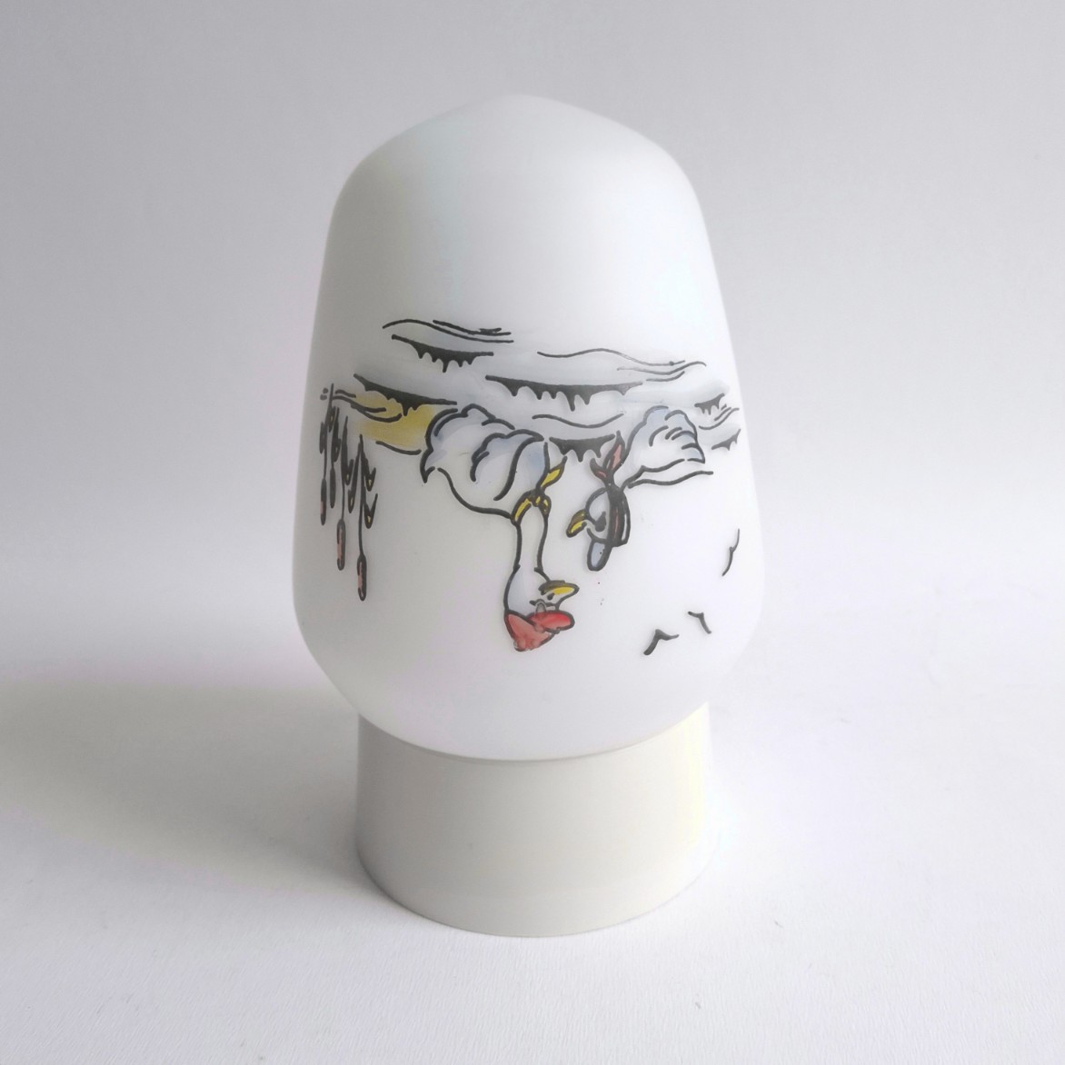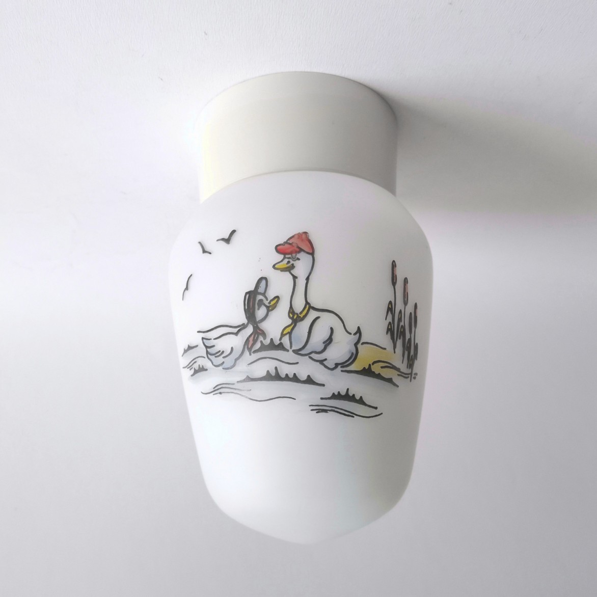 Mooie met “ganzen” afbeelding gedecoreerde jaren 60 plafondlamp.