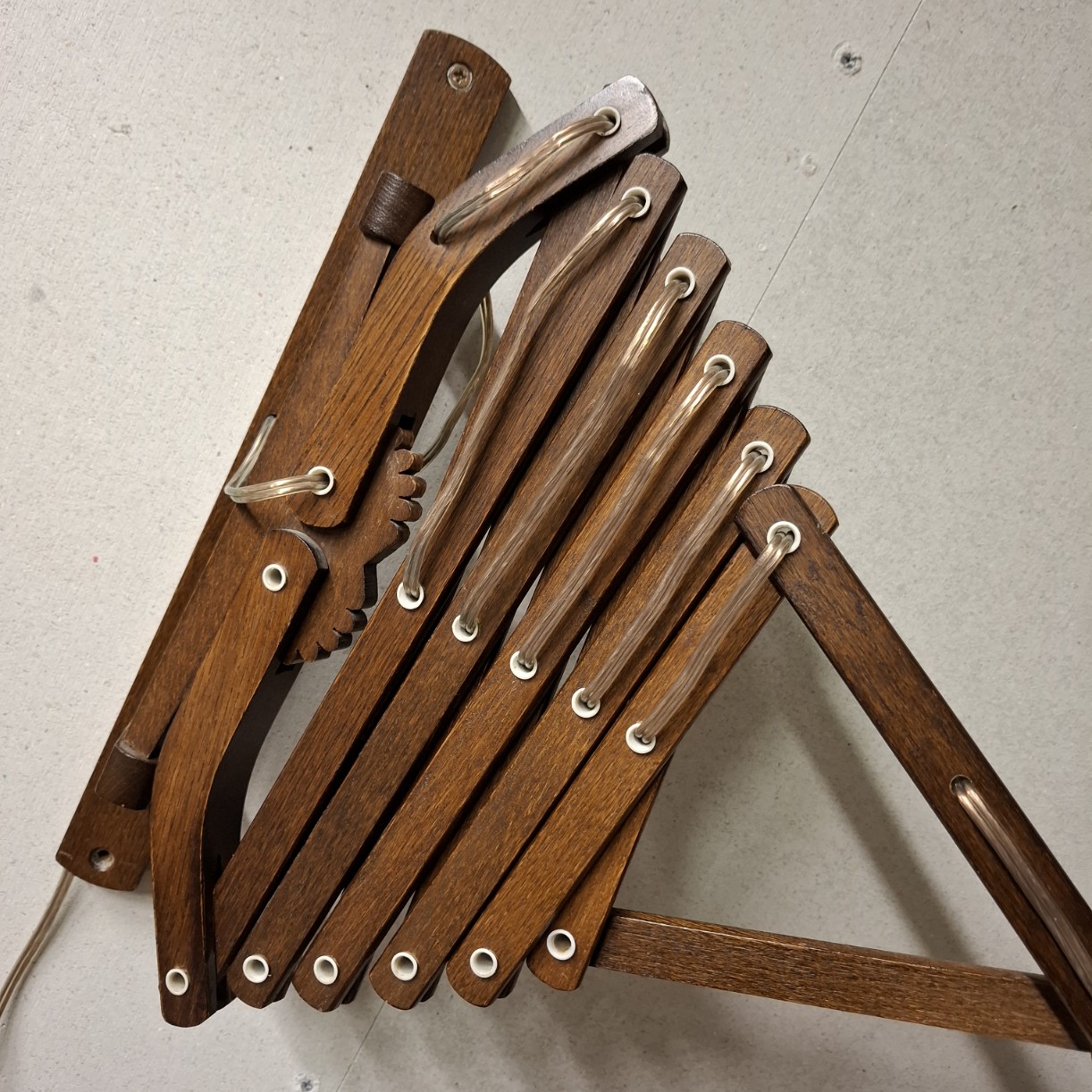 Deze schaarlamp of harmonicalamp is ontworpen en middels een octrooi vastgelegd door vormgever T.J.W. Zweers uit Bussum en heeft het bijzondere kliksysteem bij het uittrekken van de lamp.