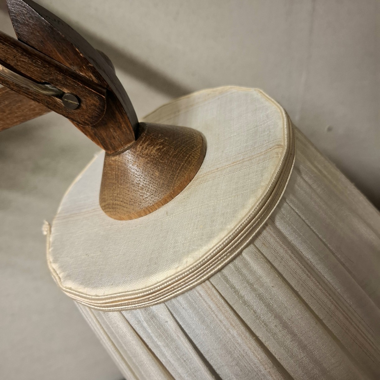 De houten wandlamp komt met authentiek snoer en snoerschakelaar en met originele stoffen kap waarvan de bovenzijde ook afgewerkt is met stof.